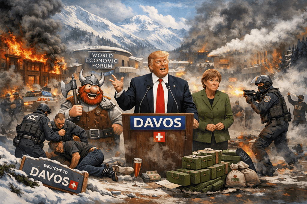 Prošlo je samo godinu dana od početka njegovog drugog mandata, ali više nikome nije do smeha. Amerikanci su dobili ono za šta su glasali: imigrantska policija – ICE (Immigration and Customs Enforcement) – uspešno glumi Gestapo i jureći ilegalne imigrante ubija svoje državljane. Na ulicama Minesote besni građanski rat koji zvanično još nije počeo, a predsednik Tramp je zažmurio na oba oka i započeo još jednu siledžijsku misiju. Ovoga puta, na red je došla „stara dama“, iako preplanuli Donald više voli one mlađe. Kako bi, posle objavljivanja „Dosijea Epstin“, smirili domaću javnost, Trampova administracija je najpre napala Venecuelu, a onda su se dosetili pijanih Vikinga sa početka naše priče i odlučili da okupiraju Grenland. A ima li boljeg mesta da cirkus zablista u punom svetlu od Svetskog ekonomskog foruma u Davosu? Na samom početku delegacija je imala problem s avionskom elektrikom jer je predsednik verovatno odmah uključio fen za kosu. Vratili su se u bazu i Ameriku napustili drugim vazduhoplovom. Po dolasku u Švajcarsku počinje tragikomedija na kojoj bi im pozavideli i autori latinoameričkih i turskih serija.