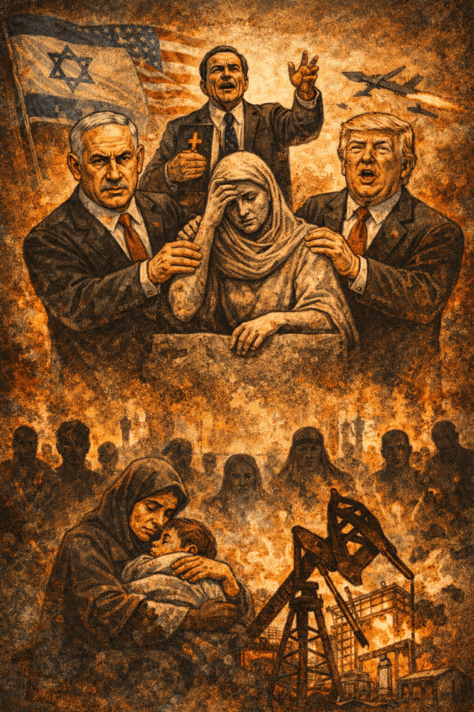 Zapad više ikome ne može držati lekcije o ljudskim pravima ili navodnim vrlinama zapadne civilizacije. Obmana da Amerika kao nacija promoviše demokratiju je završena; i upravo tu se zatvara krug. Od verskih skupova i političkih odluka, preko vojnih struktura, do konkretnih operacija na terenu. Ono što je počelo kao religijska ideja, završava se ubijanjem i proterivanjem civila. Kada vera postane deo vojne doktrine, ratni zločin više nije izuzetak — već očekivan ishod.